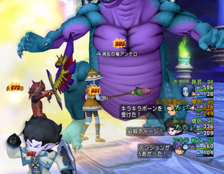真・やいばくだき、チャージタックル、ぶんまわし、たいあたり、プラズマブレード・・・前半はそうでもないのですが、後半、それも赤になってからが激しいです。サポート仲間が死んだら、他のサポート仲間は蘇生行動が遅い場合があるので、(自分が生きていたら)世界樹の葉をどんどん使いました。