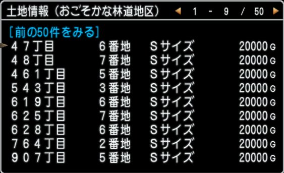Sサイズが引き続き回収されている模様、しかし・・・ 2017.10.07 10月7日、朝5時半 アズラン、林道地区 ガタラ、採掘地区 この2か所は2桁丁目が明いていました。 某地区の25丁目を買いましたが、また引っ越すかも知れません。 全部見て回ったのですが、Mサイズの回収はされていないと思いました。 トゥーンタウンは全く空いていませんでした。 この時間帯でもすぐ売れているのか、回収されていないのかは不明。