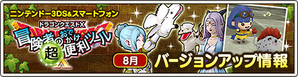 スマートフォン/ニンテンドー3DS版「冒険者のおでかけ超便利ツール」のバージョンアップ情報をご案内いたします。今回適用される内容は、8月3日(水)、8月5日(金)、8月7日(日)に公開予定です。詳しくは 『 こちら 』 をご覧ください。