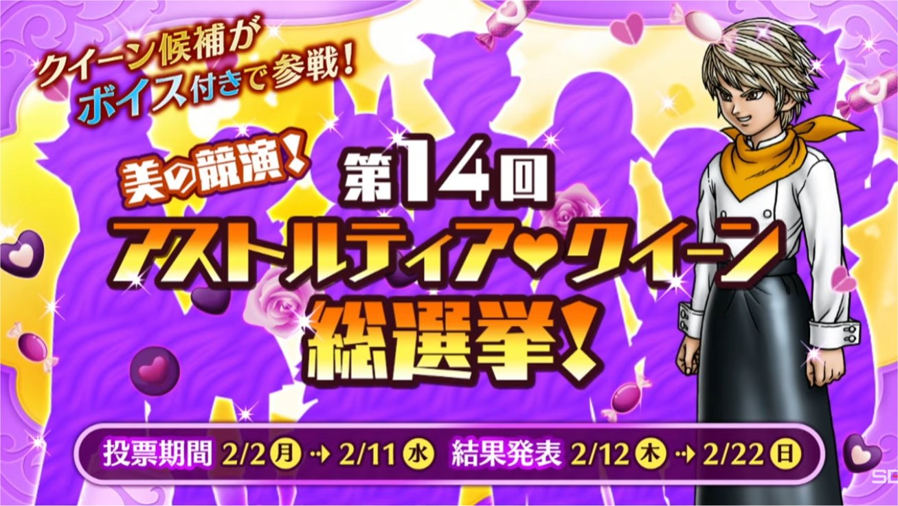 超ドラゴンクエストXTV #56 最新情報 2026.01.27 超ドラゴンクエストXTV #56 目次 プチ情報コーナー破壊神の眼甲 調整第14回アストルティア・クイーンコンテスト前回の上位3名衣装「バタフライセット」第13回アストルティア・ナイトコンテスト前回の上位3名衣装厭悪のルベランギス つよさⅢ第13回アストルティア・プリンセスコンテスト プチ情報コーナー 破壊神の眼甲 調整 上方修正! 第14回アストルティア・クイーンコンテスト 推薦枠なし。 前回の上位3名 衣装「バタフライセット」 第13回アストルティア・ナイトコンテスト 推薦枠なし。 前回の上位3名 衣装 厭悪のルベランギス つよさⅢ 新称号あり。 第13回アストルティア・プリンセスコンテスト