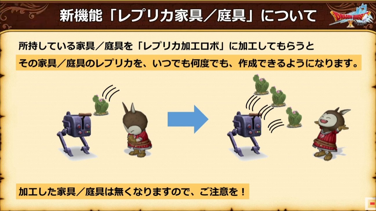 海底探索ガテリア号、新聖守護者-超ドラゴンクエストXTV #24 2021.05.18 超ドラゴンクエストⅩTV#24 ドラゴンクエスト35周年特集! プチ情報コーナー ◆海底探索ガテリア号 ・20人での協力プレイ ◆聖守護者の闘戦記・最終章 ・羅刹王バラシュナ 2021年6月公開予定 今後のアップデート内容について(予定なので変更になる可能性はある) ・万魔の塔の「大紋章」の合成はお待ちください。 ・家具・庭具は売ったり捨てたりしないで・・・ ◆万魔の塔の調整 ・大紋章の合成に+1、+2をつかなくし、+3、+4、+5しかつかなくなる。 ◆ギラムポイント50P→万魔の大紋章の破片×15交換可能に(毎週1回) ◆レプリカ家具・庭具を作れるようになる。