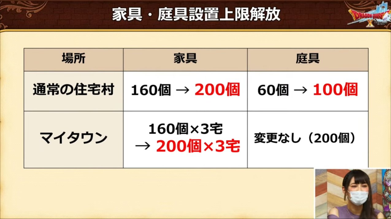 要望の多かった話だと思いますが、庭に職人設備を設置できるようになります。マイタウンだったら、素材屋やバザーの近くに設置して便利にすると良いでしょう。