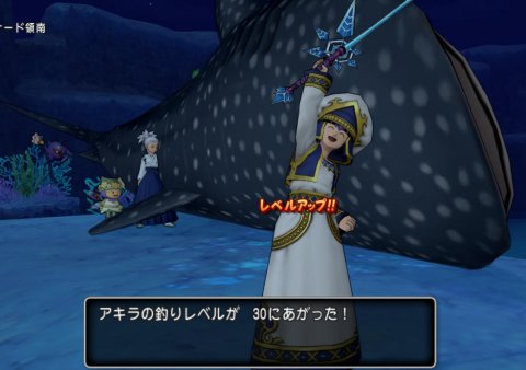 ヴェリナード領南の大物ポイントでレベル上げをしていました。闇の釣り竿改から氷の釣り竿改に変えてからジンベエザメが釣れる確率が上がって、はかどりました。